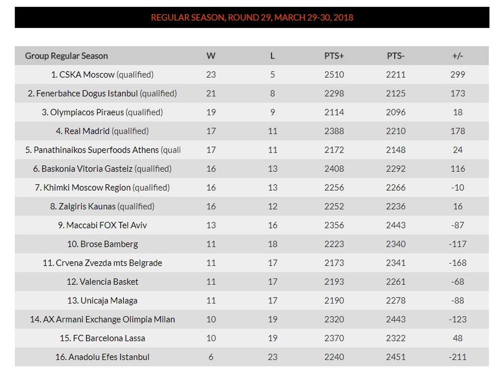 Η Τρέχουσα Βαθμολογία της Euroleague 2023-2024